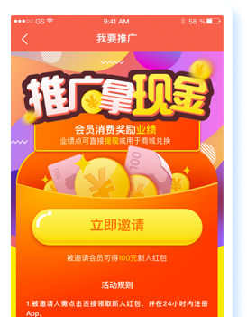 普通App用戶激活成為App推廣員后,分享相關(guān)鏈接邀請好友注冊App。好友成功注冊App之后在App中購買商品即可為推廣員提供相應(yīng)的業(yè)績點(diǎn)返點(diǎn)。